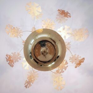 Some designers drew directly from flora. Itsu lamps—clearly inspired by the floral brass lamps of Paavo Tynell—embody how his organic influence extended beyond his own production at Taito and Idman. Toini Muona and Francesca Lindh pressed real leaves into ceramics, while Rut Bryk and others hand-painted fruits and flowers. In contrast, Birger Kaipiainen took flora to a dreamlike realm, transforming blossoms into surreal, enduring symbols.