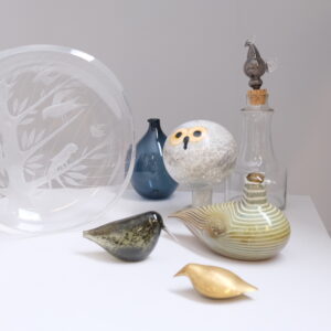 The Finnish imagination often gave life to animals—both playful and symbolic. Oiva Toikka’s glass birds and Taisto Kaasinen’s animated ceramic creatures remain icons of creativity, while Arabia and Kupittaan Savi produced countless animal and fish figurines, often with humor and tenderness. Birger Kaipiainen extended the theme into fantasy, transforming butterflies and birds into decorative worlds beyond reality.