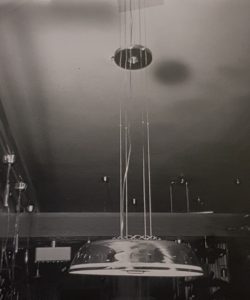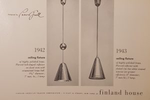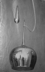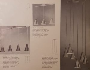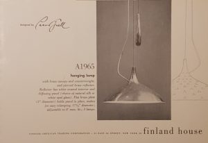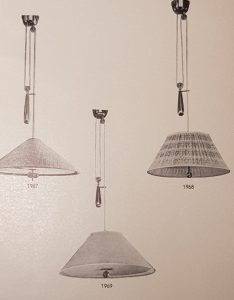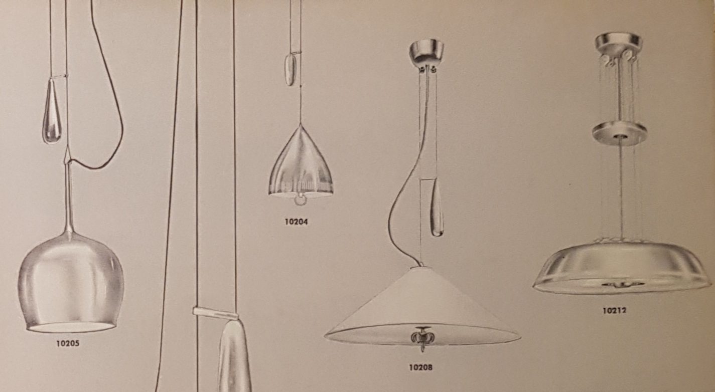 “All lamps were made according to the United States electric appliances regulations. Because the ceiling lamp was not allowed to hang supported by the electrical cord, Paavo Tynell designed a counterweight-operated lift mechanism, which became one of his trademarks.” This was in reference to the iconic A1965 lamp