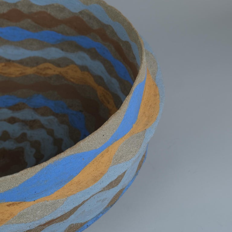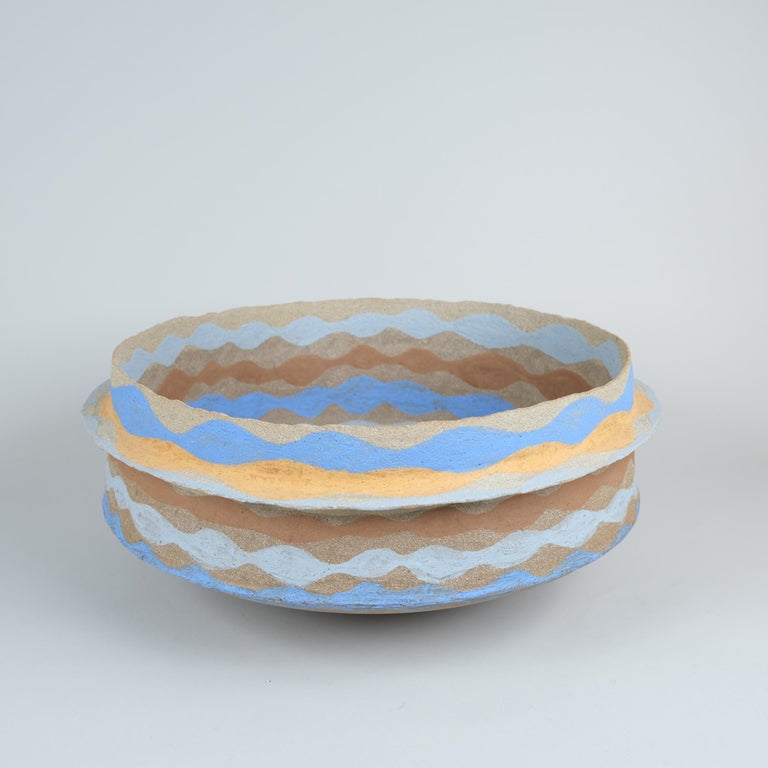 This beautiful piece is from the Morocco series inspired by traditional Moroccon pottery with reddish brown clay and vibrant hand coloured motifs. Of the series, this is the highest one and is shaped differently with an edge circling the circumference. It has a beautiful calm and natural colour combination which would easily integrate in different interiors. This piece is from the Artist`s own collection and is stamped with her initials.