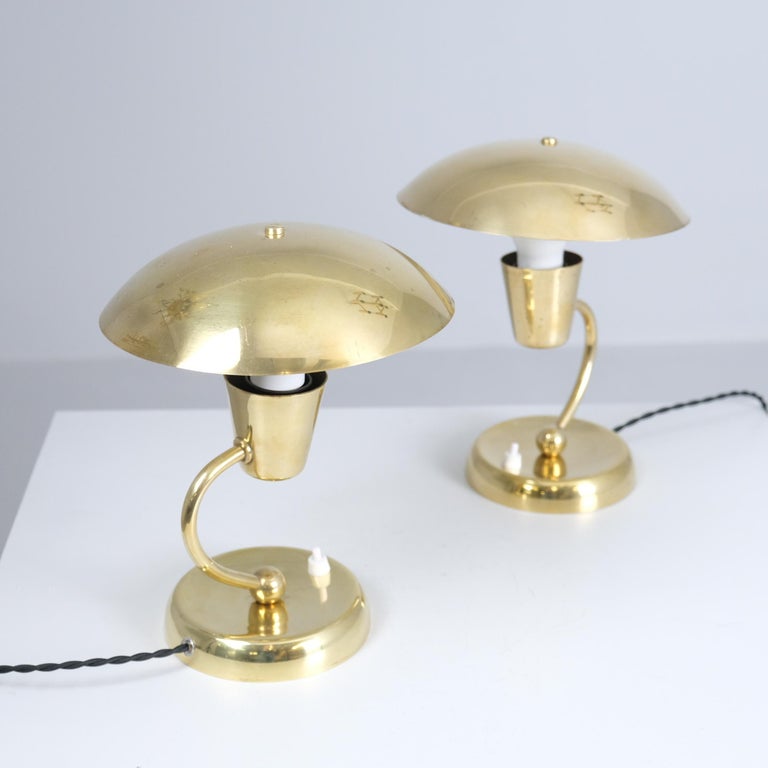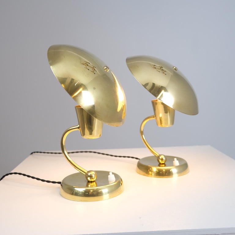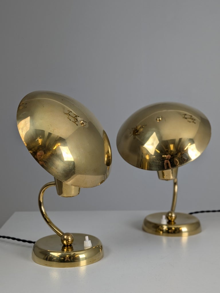 A beautiful pair of table lamps in brass model EV59 made by Itsu, Finland in the 1950s. The shades are detachable and adjustable so they can be placed to direct the light in different directions and add a beautiful ambience. Perfect for side tables or night stands.