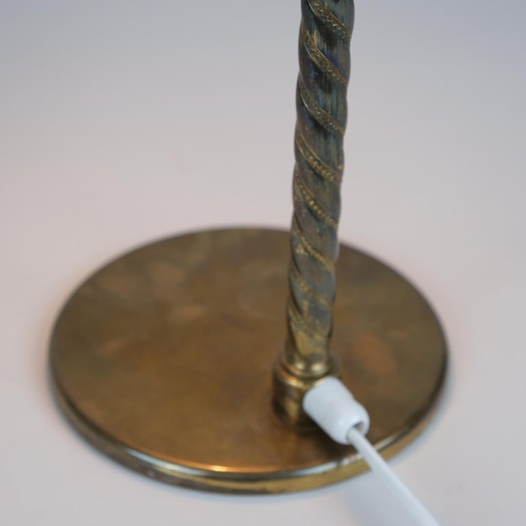 A gorgeous and possibly unique seashell lamp by Paavo Tynell in full brass and larger than the usual versions seen in the market. The leg is in full brass rather than the usual rattan seen on this model. Tynell used different kinds of materials on the same lamp models from time to time. The materials varried from rattan and leather to different kinds of wood and brass decorated stems. Also, as mentioned this piece is quite sizable. Please refer to the photo with a smaller version next to it.