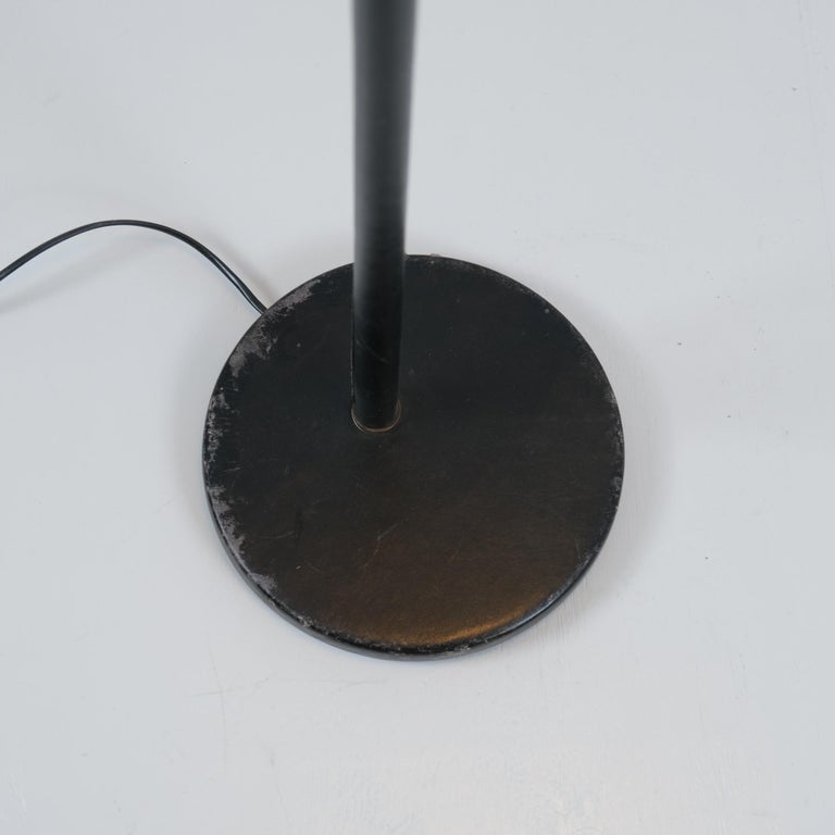 This lamp is ingeniously designed as the shade is intentionally of asymmetrical measuremts to both sides of the stem. Make no mistake however as to the quality of manufacturing, as it was produced by Valaistustyö, one of the leading lighting companies in Finland at the time. The patina of 70 years is evident by beauty scratches on the leather stem of the lamp here and there. The beauty scars also add a unique touch and character to the lamp, and confirm it´s originality.