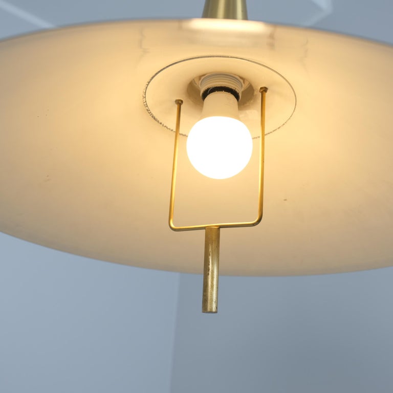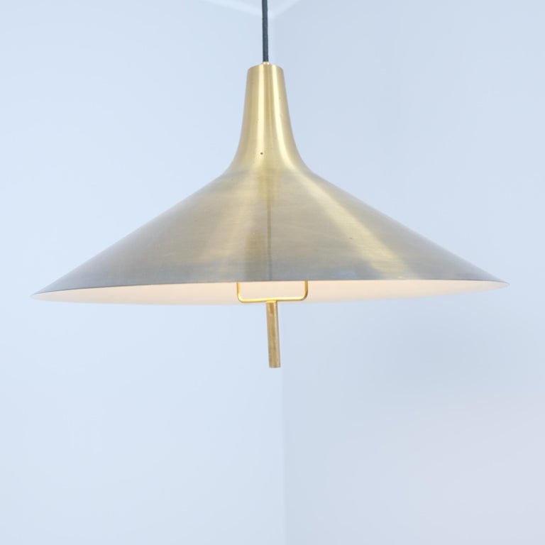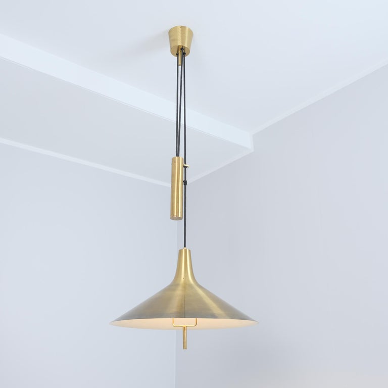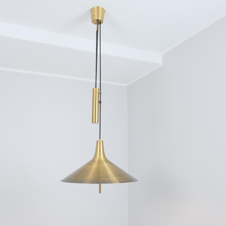 A beautiful mid-century modern adjustable ceiling pendant by Th. Valentiner Copenhagen, Denmark produced in the 1960s. This adjustable lamp with a wooden pully technique allows for height adjustability between approximately 125cm-200cm so it can be placed in a wider range of spaces with different ceiling heights. Perfect above tables as it offers concentrated down light, but with it’s asthetic modernist appeal, it can be placed in different spaces within modern interiors.