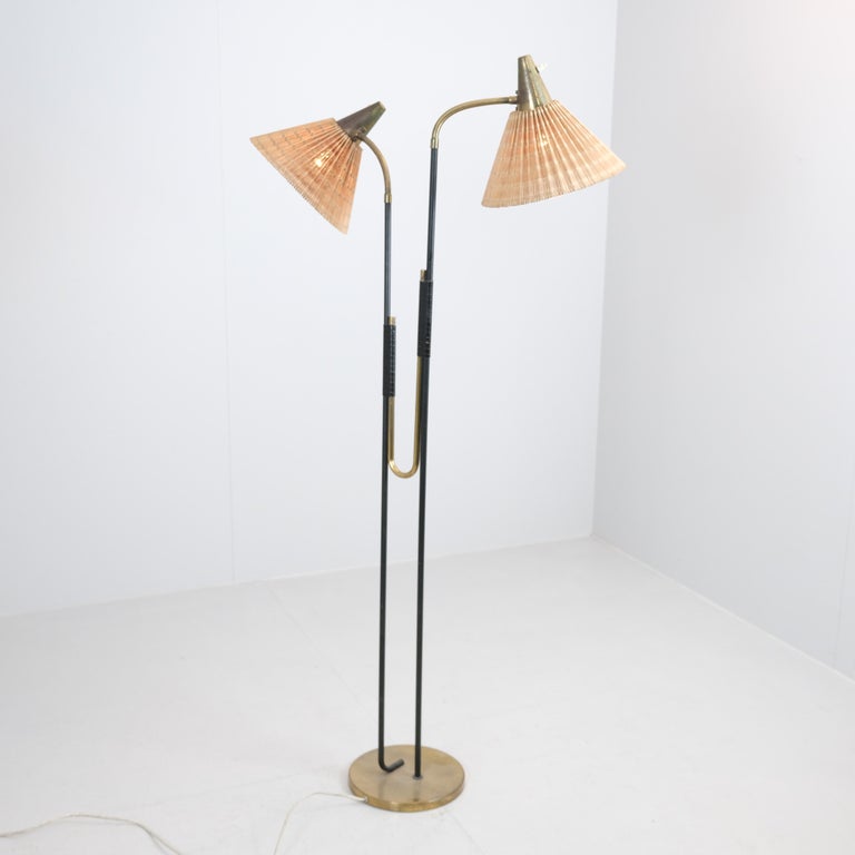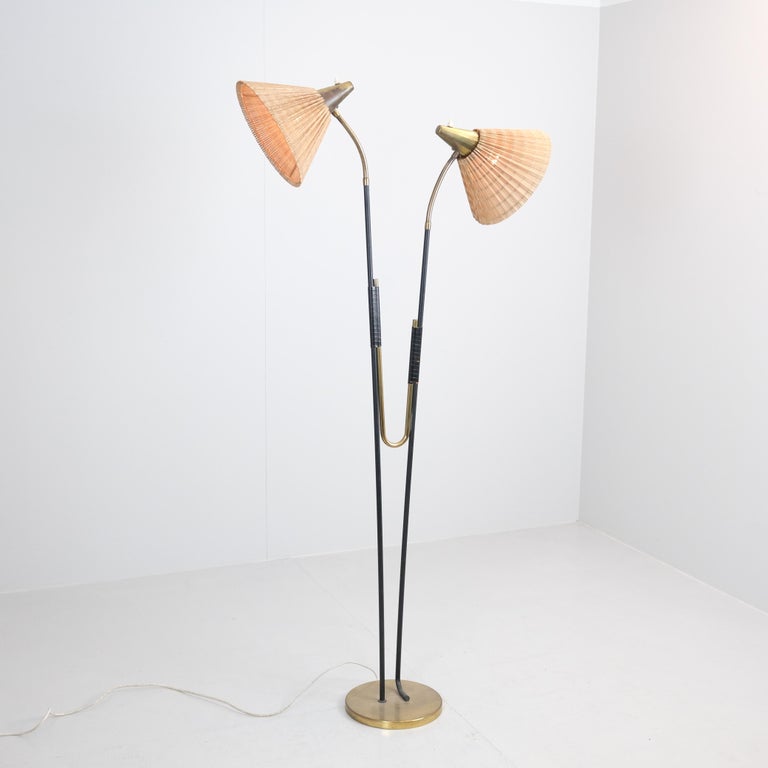 A somewhat rare Itsu floor lamp featuring an elegant and well-balanced design with two distinct, independently adjustable light heads that can be directed almost freely to suit different needs. The combination of black-painted metal, rattan, leather, and brass details creates a harmonious contrast, giving the lamp a simple yet sophisticated presence. Highly functional in nature, this floor lamp works equally well in private interiors and professional environments, and is suitable for use in living rooms, bedrooms, offices, or reading areas.