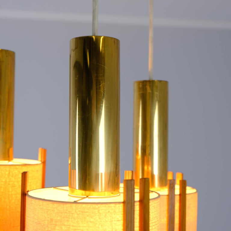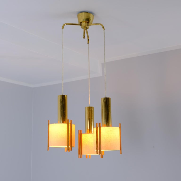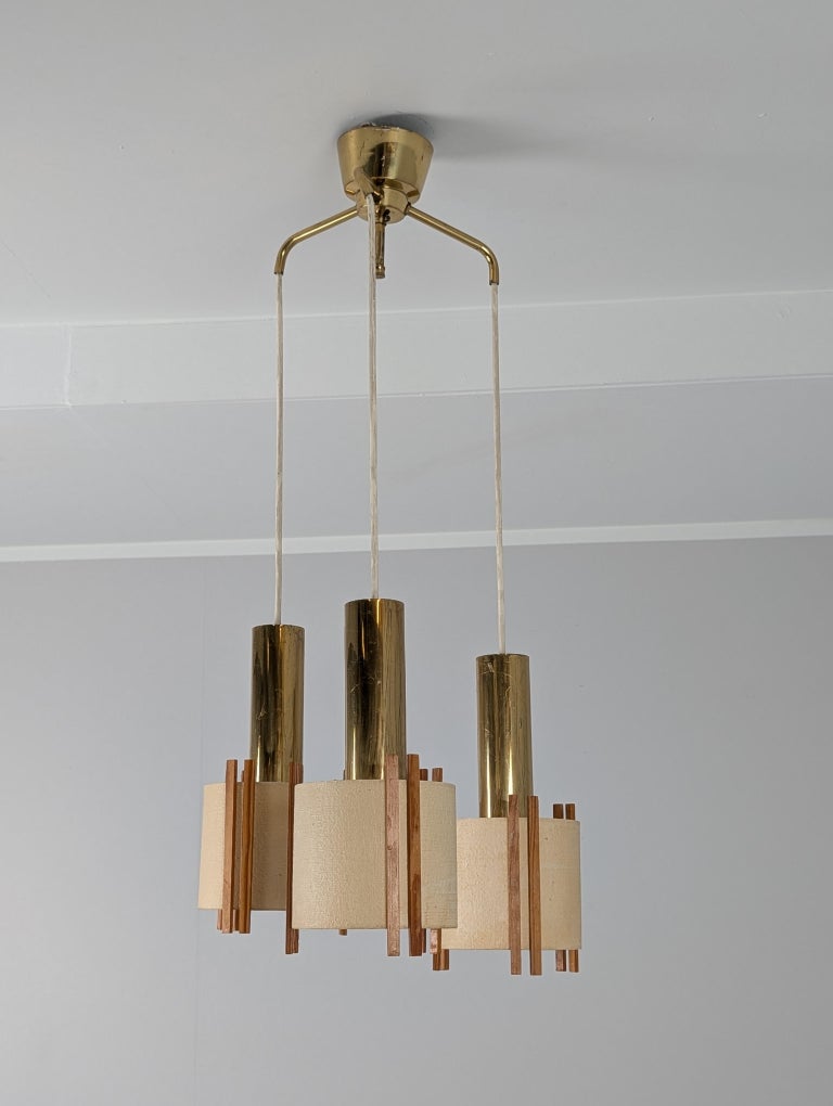 A beautiful Mid-Century Modern Finnish ceiling lamp from the 1950s–60s. The pendant features a brass canopy with three hanging lights suspended from brass tubes, each fitted with paper shades decorated with minimal pine details. A poetic modernistic natural detail often seen in Nordic design language of the era. Orno has similar designs. This lamp works perfectly above a dining table, kitchen island, or countertop, and also becomes a sculptural, atmospheric accent when placed in a corner or lounge setting. The height is adjustable, as each light hangs from a cord, and the three light sources can be set at different lengths for a more asymmetrical and artistic composition if desired. Original condition with no restorations made. Moderate wear consistent with age and use.