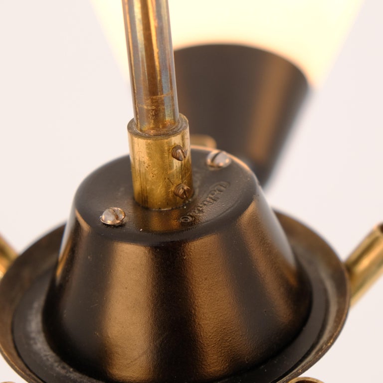 A Mid-Century Modern ceiling lamp model 2558/5 by Valinte c. 1950s, which was one of the leading lighting manufacturers in Finland. The lamp features a brass frame with five arms with black painted metal center and shade holders. The shades themselves are white opaline glass. The lamp is stamped Valinte to the center and is in original condition. A beautiful mid-century piece that is truly timeless. Suitbale for modern and eclectic interiors, in living rooms, bedrooms, game rooms, or studies.