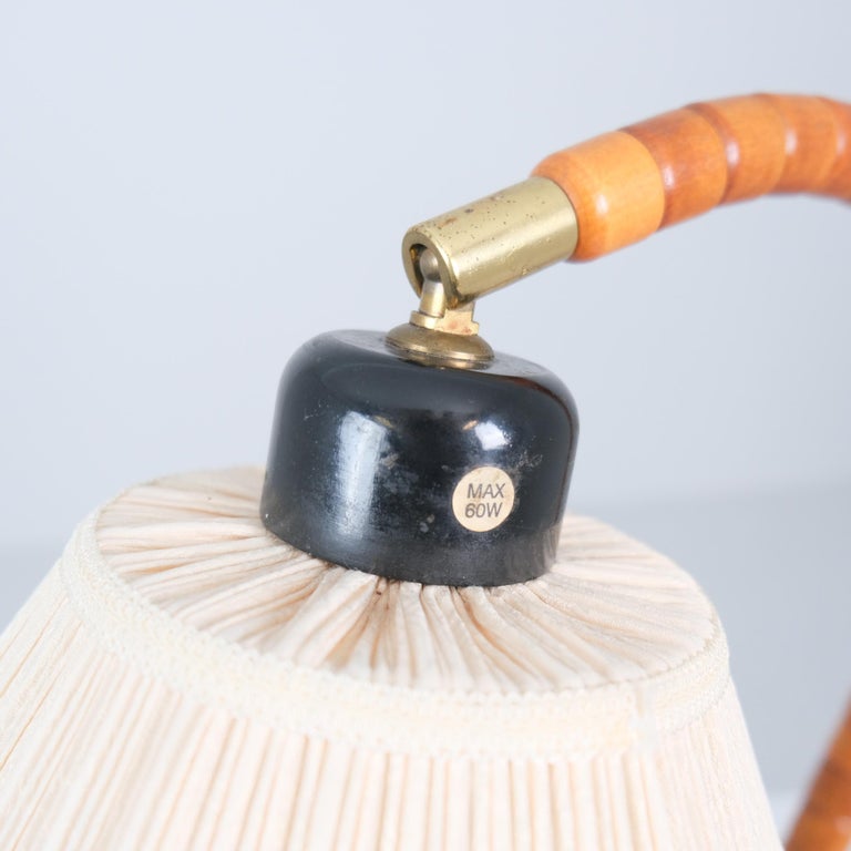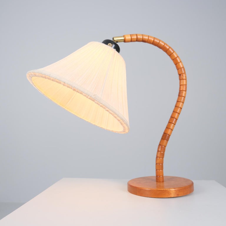 Sculptural Scandinavian Modern table lamp model 1911 by Markslöjd, Sweden, made in the second half of the 20th century. This sizable lamp features a beautifully curved arm made from small, turned wooden segments stacked along a flexible core, creating a smooth organic line that recalls the movement of a swan’s neck. The base is solid wood with a warm natural tone, and the lamp is completed with a pleated fabric shade that softly diffuses the light.