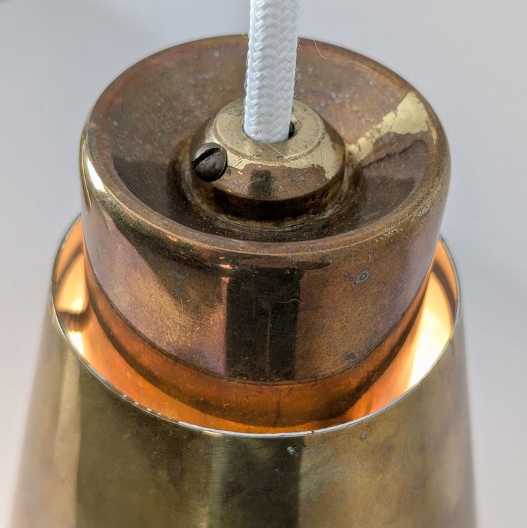 Rare modernist brass ceiling light by Paavo Tynell with three hanging perforated shades. Each shade is crafted in full brass and connected at the top by a brass canopy and a radiating bridge arm that extends softly to both sides. The perforation adds a decorative, warm glow, giving the lamp a quiet elegance. It works beautifully above dining tables and kitchen counters, in elongated hallways or living rooms, and in public interiors such as restaurants, bars, offices, and hotel lounges. The patina on this example is especially beautiful.
