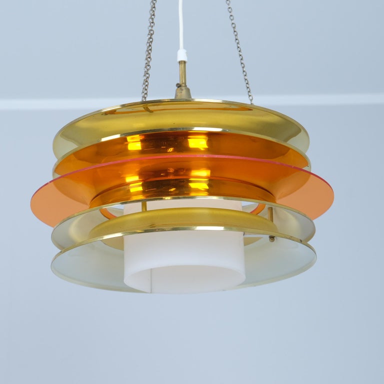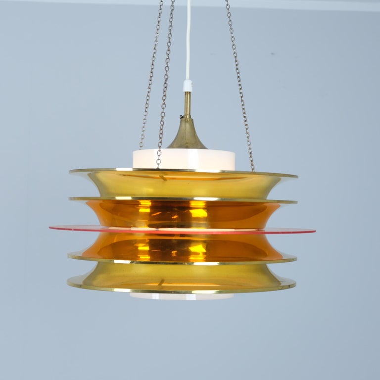 A modernistic slatted ceiling pendant by Finnish designer Kai Ruokonen (Finnmark) consisting of 4 brass slates in with an orange see-through circular centerpiece and a white acrylic cylinder as a light diffuser. A futuristic piece that not only suits spage age interiors, but also modern sleek and colourful interiors.