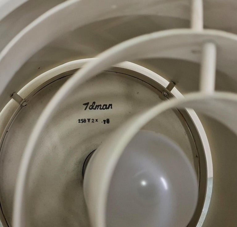 This ceiling lamp came from the Stora Enso building which is situated right next to the presidential palace in Helsinki. Quite a few of them were sold in auction a couple of years ago, as the company was renovating their premises. Alvar Aalto usually designed the lamps and furnitures for the same buildings that he designed as an architect.
