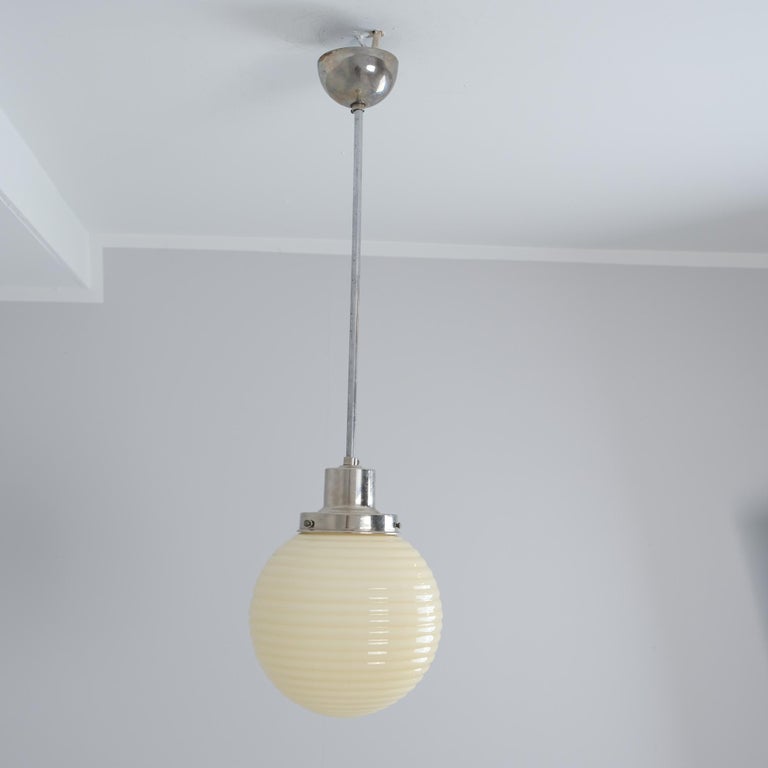 A beautiful art deco Paavo Tynell lamp in nikkled brass with a cream colour wavy surfaced opaline glass shade. The lamp model is 1601 featured in one of the 1930s catalogues. Perfect for kitchens, small spaces or as a side lamp. According to the catalogue, the model was available with different shades ranging from 16cm upwards. This has a diameter or 18cm. The lamp came to us from the ` Ilveslinna` building in central Finland which had all lights by Paavo Tynell.
