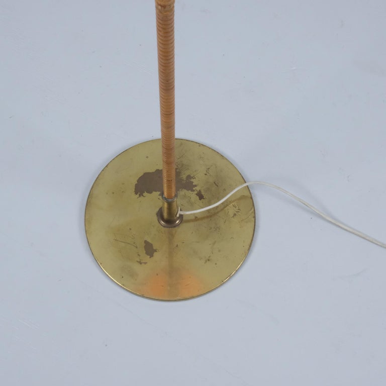 A very rare floor lamp model 9627 designed by Paavo Tynell and manufactured by Taito Oy in the 1950s. This particular model is rarer than some of Tynell`s other well known models such as 9602 or 9628. However, still featuring the original classic brass and rattan stem like the other models. The lampshade has been remade in rattan according to the original measurements, otherwise all original parts remain. The lamp is in great condition, and has beautiful 70-80 years patina.