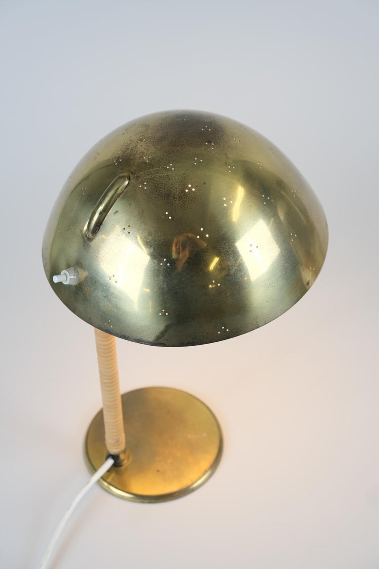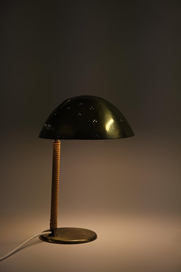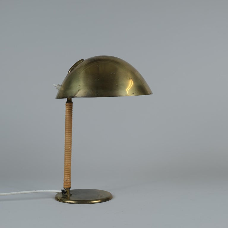 Paavo Tynell Helmet Table Lamp 9209 in Perforated Brass & Rattan, Taito 1950s