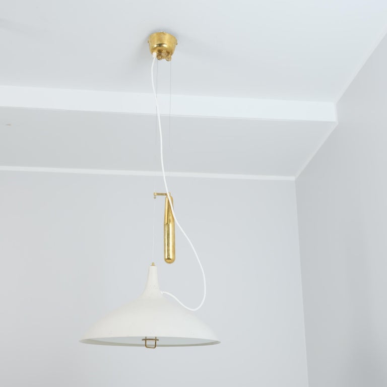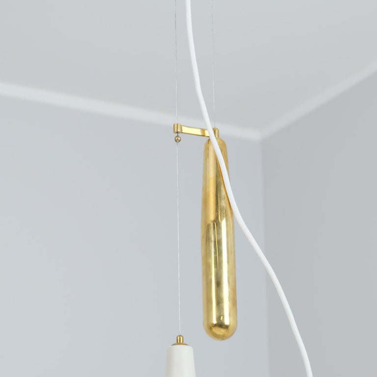 Paavo Tynell created the counter weight lamp design in response to American lamp specifications, that did not allow lamps to hang by electricity cords on their own. The result was a whole series of counter weight lamp designs of which this model, the 1965 was the most recognizable and an all time favorite and classic.