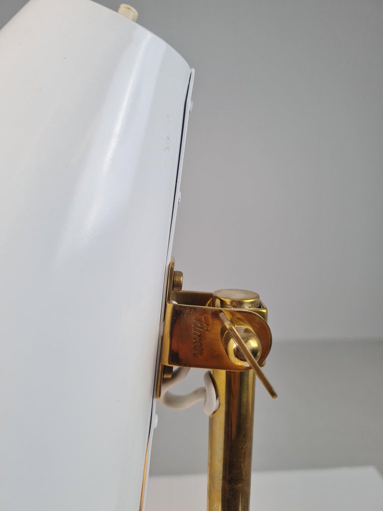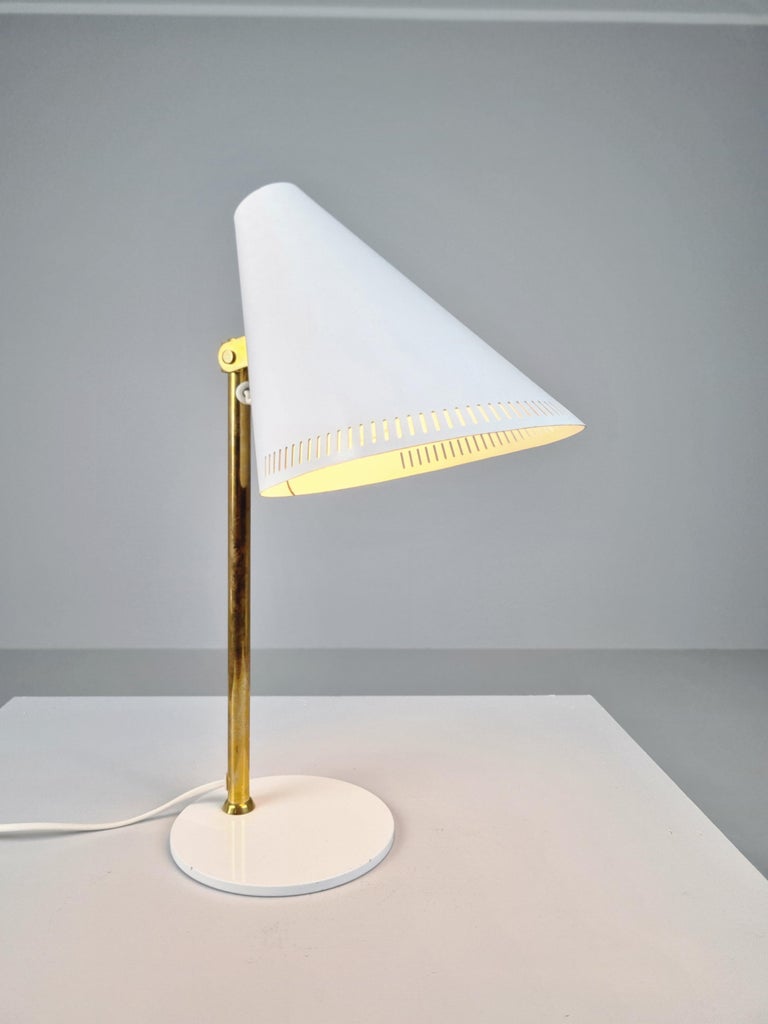 This table lamp model H5-7 by Paavo Tynell is a time lasting and practical model featuring 3 different metal materials. In this model a firm brass stem supports aluminum cone shade. The shade is matt white and is adjustable for your needs. The light switch is on top of the cone. The metal base is wider and flater than in model 9227.