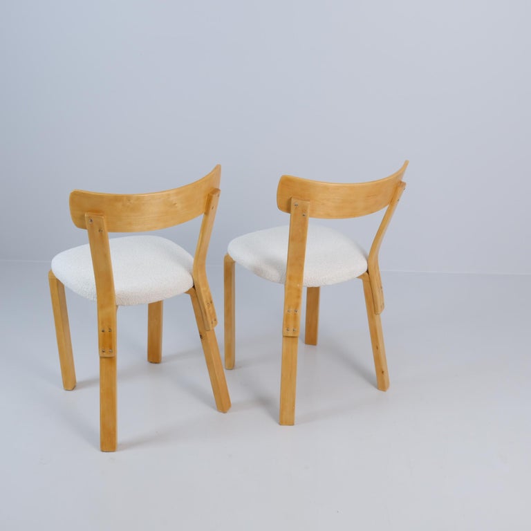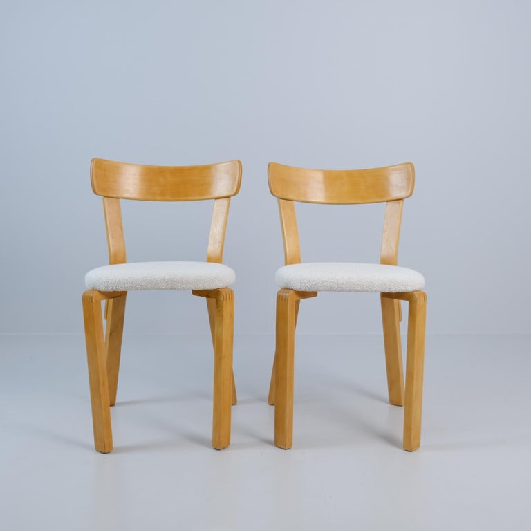 A rare pair of Alvar Aalto model 69 chairs, manufactured during the 2nd World War years in Finland in the 1940s. The iconic L-leg is different in these pieces compared to the normal. As a result of the war, Finland had a shortage of resources including glue, which was normally used in these chairs, so Aalto came up with a new design called the finger joint, to save recources during difficult times.