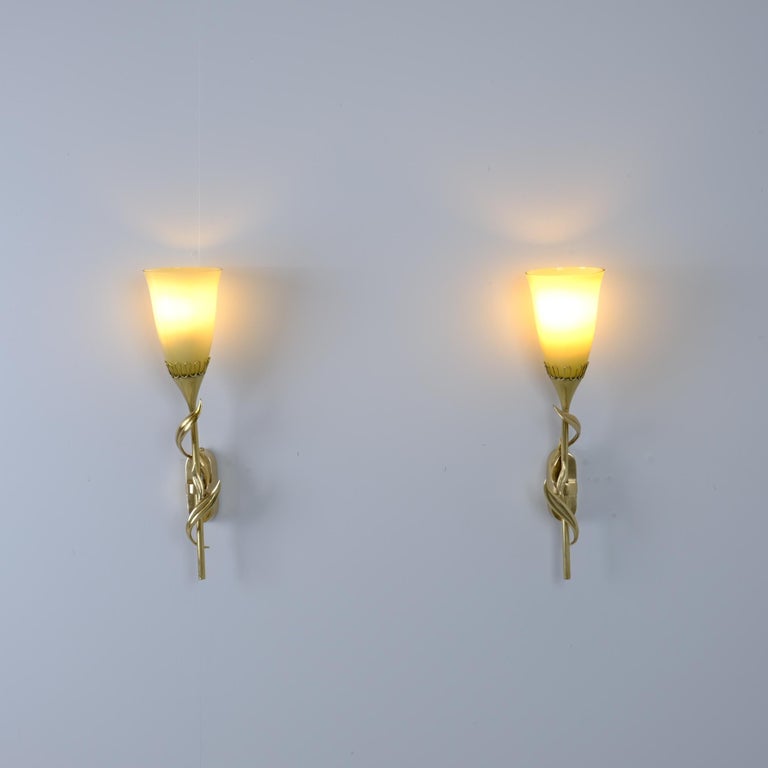 A rare pair of wall lamps by Finnish designer Mauri Almari, model 71032, in full brass with mouth-blown champagne glass shades. Manufactured by Idman in the 1950s, this model existed in a two-light version and this rarer variation with a single light each. The form is sculptural and delicate. The brass floral body and tulip-like shade have a poetic quality that immediately calls to mind the floral language and organic style seen in Paavo Tynell’s lamps of the period. These Almari pieces come from that same golden era of Finnish material romanticism — refined, warm metal craft meeting poetic natural forms. Perfect for ambience and soft atmospheric lighting. Ideal for entrances, framing wall artworks, living spaces, or as refined bedside lamps. The lamps have been fully restored (polished, lacquered and rewired) while retaining all original parts except for the renewed wall brackets. The glass shades are original. Fits E14 screw bulbs.