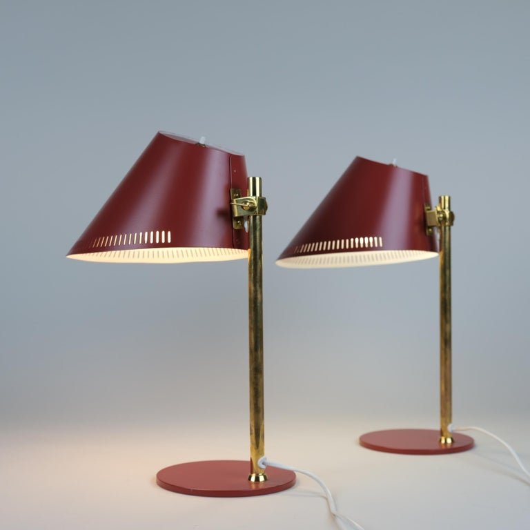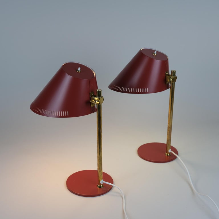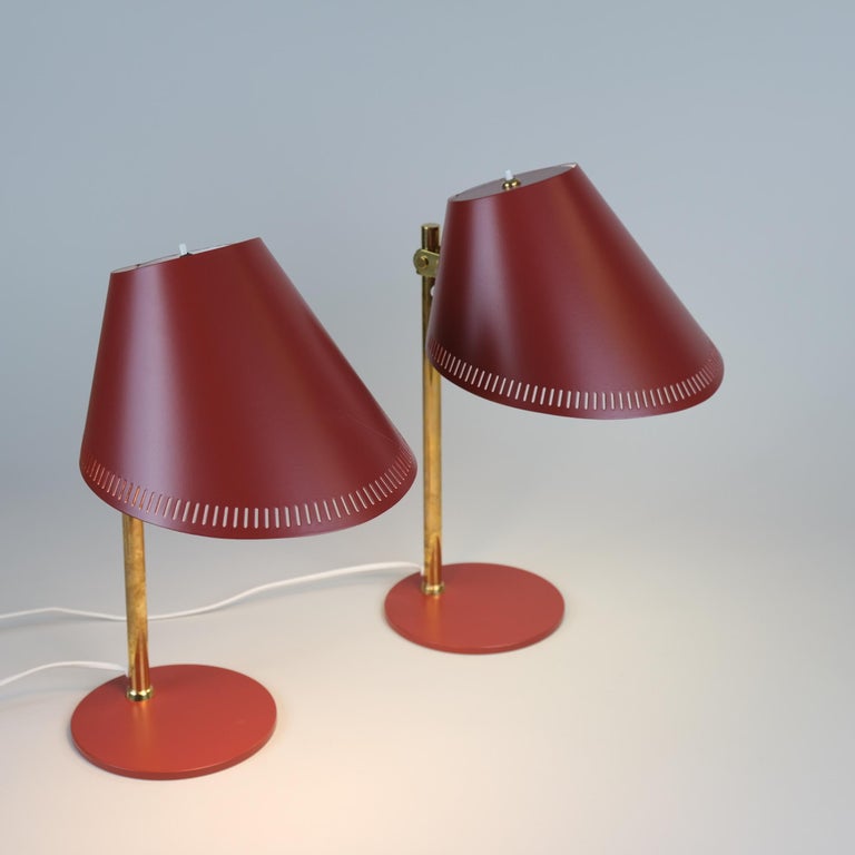 Pair of Paavo Tynell Table Lamps Model 9227 in Red and Brass, Idman 1950s