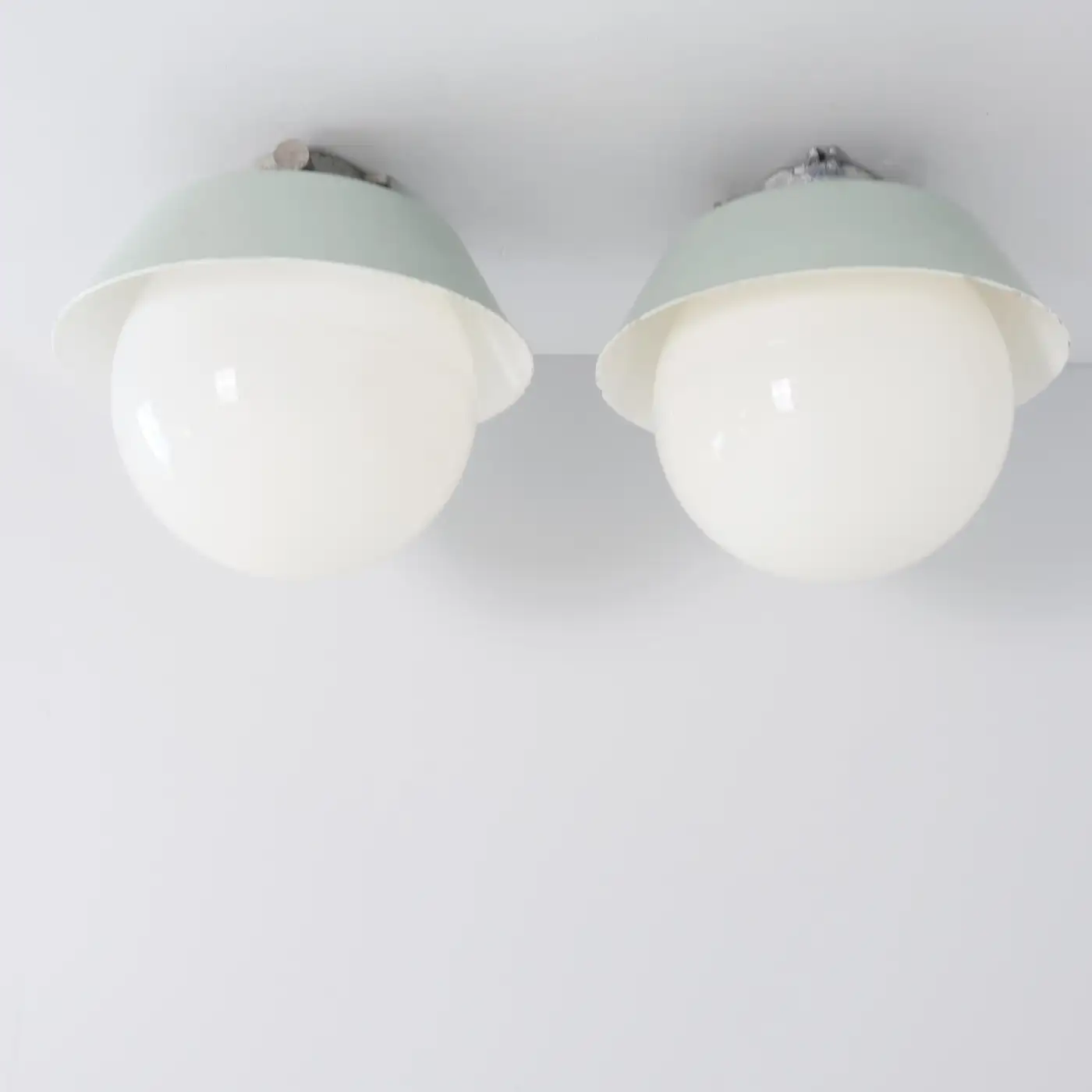 A pair of sizable industrial style Paavo Tynell outdoor / indoor lamps. These lamps model 2421-2453 are quite large with a big opaline glass ball shade that is easily screwed in and out of place to change the light bulb. The lamps have a beautiful fresh and original greenish gray colour that is easy to integrate in any interior or exterior. Please note that the light bulbs in the pictures are different. One is cool while the other is warm to give you and an idea on how different they can look. Both lamps (2) are stamped and have small beauty scars here and there.