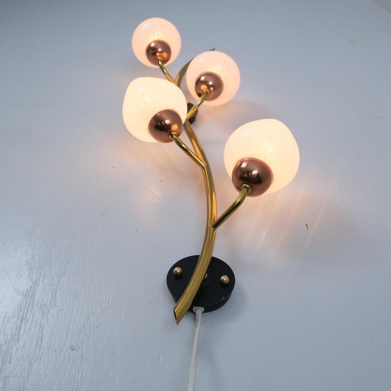 A beautiful floral wall sconce featuring a gracefully curved branch-like brass tube with four delicate copper buds. Each bud is topped with a tulip-shaped shade of striped white glass. The entire assembly is mounted upon two contrasting black circular bases for wall attachment.