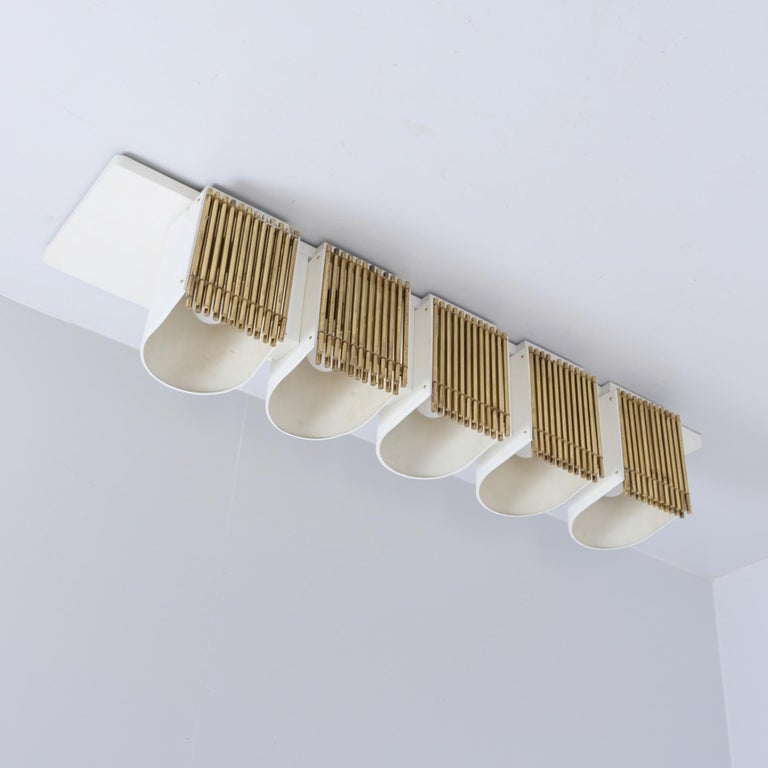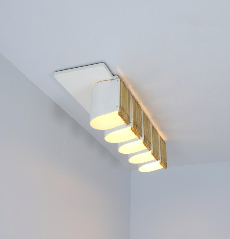 This commissioned ceiling lamp is designed by architect Alvar Aalto for the conference room of the Finnish forest industry company Enso-Gutzeit Oy in 1960s. It has a simple form yet it’s quite impressive looking. The lamp is in brass and lacquered metal with white paint. There are five light sources and they are each inside of a round arch. The lamp is perfect for large spaces, over kitchen, bar counters, windows, or elongated spaces.